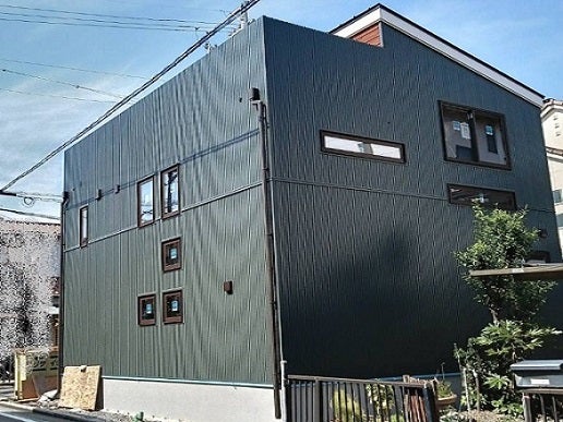 仕上工事が順調に進んでいます。外部の足場も撤去され漸く建物の外観を見ることが出来るようになりました!外壁はガルバリウム鋼板です!モスグリーンでかっこいいです。
