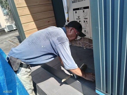 玄関タイルの施工も終了しました。下地の施工も丁寧に水平にならし、どう貼れば収まりが良いかタイルの配置を考えて貼っていきます。使用タイルはタイルの中でも耐水性が最も強い磁器質タイルです。丈夫で汚れにくいという特徴もあります。