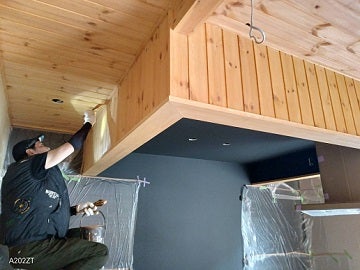 内部の木板部分の塗装工事が完了しました。塗膜を作らず木の調質性を生かしたノンロット塗料を使用しています。刷毛で丁寧に塗装していきます。