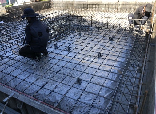 ほぼ組みあがったところで並行して水道屋さんがコンクリートに埋設する部分の配管工事を進めています。配管により鉄筋を裁断してしまうところには、補強筋を入れます。補強筋の位置や重ね合わせ長さもしっかりと確認します。