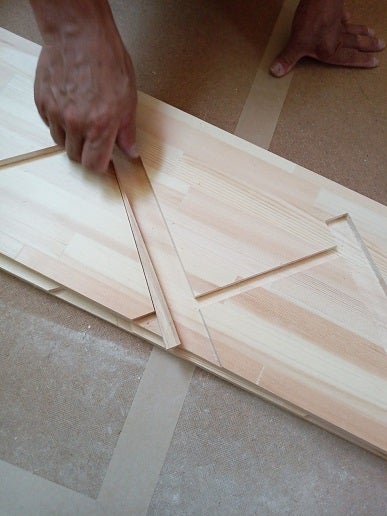 板が入るところは、斜めにカットされていて歩いたときに音が鳴らないように仕上げるために楔をいれてしっかりと取り付けていきます。
