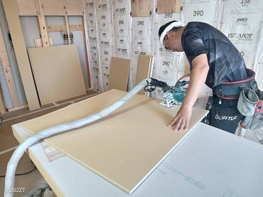 建物内部の工事は、壁のプラスターボード張りを施工しています。勾配天井で化粧母屋や化粧火打ち梁が現しになっている部分は、棟梁が直接採寸してボードをカットします。