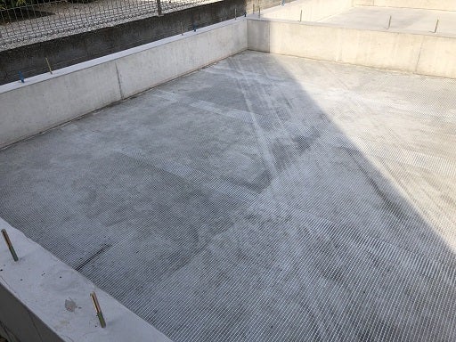 割れ防止としてメッシュシートを敷き接着剤を前日に塗布し、