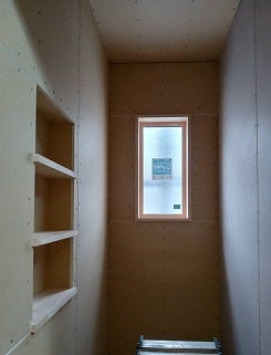 内部工事は木工事が順調に進んでいます。2階のプラスターボード張りが終わり、各部屋ごと仕上げています!ボード張りの終了後に、ボード種類の確認、ビスピッチが基準通りに施工されているか、ボードの割れがないか等をしっかり確認しました!
