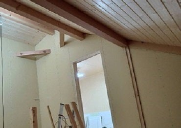棟梁は紐材と言われる細長い木材をカットして内部壁の隅部に縁取として廻していきます。