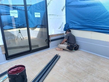 外部では、バルコニー防水工事が終了したので水切りの取付や透湿防水紙を外壁面に縦横の重ね合わせの長さに注意しながら張っていきます。