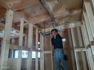内部は壁に断熱材を充填する前に、給排水配管工事と電気配線やコンセント・スイッチの取付工事が進んでいます。