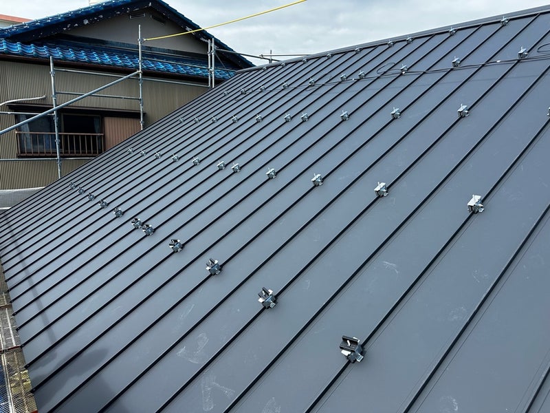 太陽光のパネルを載せる工事を行いました。まずはパネルを固定するための金具を屋根のハゼ部分に取り付けます。金具が取り付けられたら配線を確認しながら1枚ずつ丁寧に並べていきます。今回は全部で16枚のパネルを載せました。方角、陽当たり共に条件が良いのでたくさん発電してくれるはずです!