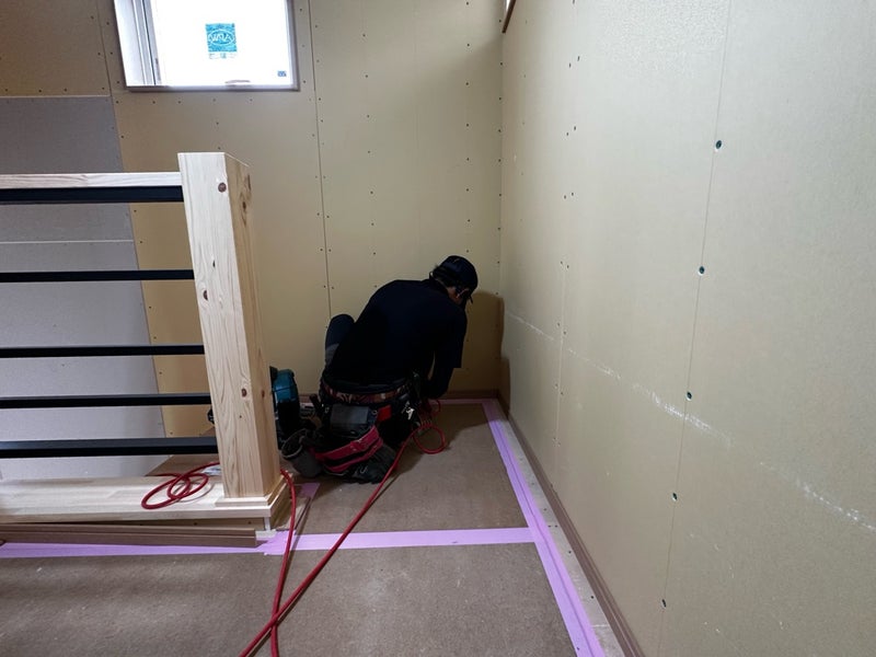 ニッチや棚の施工が一通り終わり、廻縁と巾木の取り付けを行っています!来週末には扉本体を取り付けて大工さんの工程が終わる予定です。その後はクロス工事、照明と設備の取り付けに進んでいきます。完成まであと約1ヶ月!N様、楽しみにしていてください!