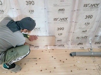 使用している断熱材は、グラスウールで室内側の表面は防湿フィルムで覆われています。壁内の湿気を透過させ水滴を防ぐ役割のあるシートです。床合板の上にフローリングを張ってい行きますが、シートが長すぎると施工に支障がある為、棟梁は壁の最下部にあたる床上にこのシートを耳掛けし適宜カットしています。
