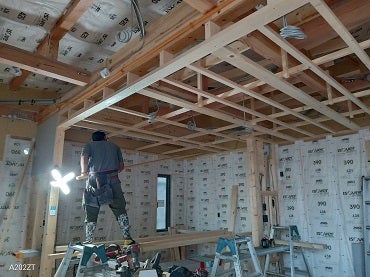棟梁は天井高さの基準となる墨出しをし、野縁材や間柱をカットして天井を組んでいます。