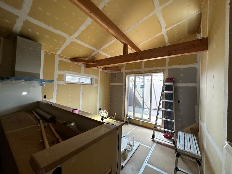 内部はクロス工事が始まっています。ボードの繋ぎ目やビス穴を平にするパテ処理を行っています。パテ処理後はクロス貼りに進んでいきます。完成までもう少しです。楽しみにお待ちください!