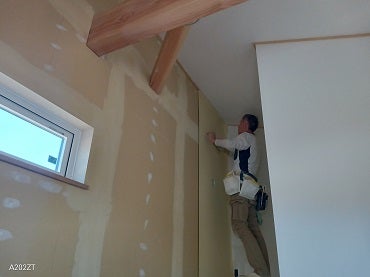 内部では仕上工事が進んでいます。クロス屋さんが壁のプラスターボードのビスや継ぎ目などに下塗りから仕上げ塗りまで綺麗にクロスが貼れるように入念に3回パテ処理を行って下準備をします。