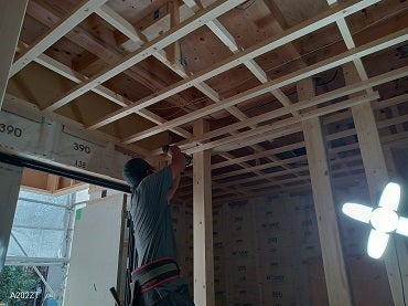 内部、外部共に工事は順調に進んでいます。内部工事は先週に引き続き、棟梁が天井下地工事を行っています。