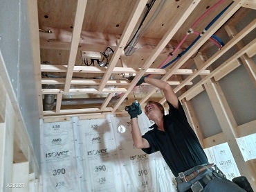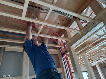 これで全ての天井下地工事が終了になります。この後は、天井を張っていきます!見えなくなってしまう前に電気屋さん、水道屋さんが天井内部の配線や配管工事を進めています。