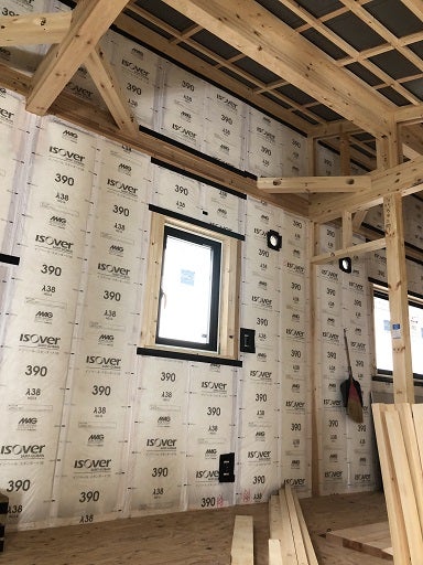 内部木工事進めています。断熱材の充填工事が終了しました。