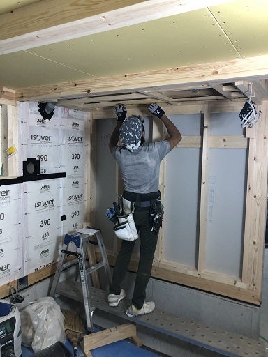 ビスの長さや間隔もしっかりと確認しております。1階部分はほぼ終了です。この後、2階部分にとりかかります。週末の現場打合せ時には全ての天井ボードが、施工完了となっている予定です。ご案内させて頂くのを楽しみにしております。