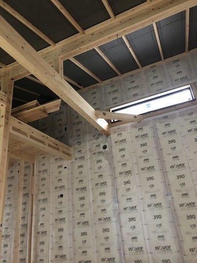 この後、外部の破風鼻隠しを取付、軒裏の施工を進めて、天井の無垢板貼りとプラスターボード貼りに取り掛かる予定です。