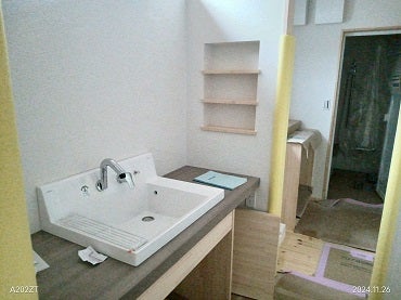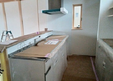 仕上工事が順調に進んでいます。照明器具やトイレ、洗面器などの衛生設備機器、キッチンの取付工事を行っています。