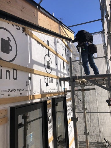 外部では、外壁を張る準備として軒廻りの換気材や窓廻りの部材の取付を進めています。