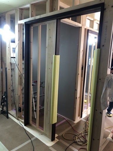 開口幅やスイッチ等の位置、建具どおしの収まりを確認して取付を進めます。枠材の取付が完了しましたら、壁のプラスターボード張りを進めていく予定です。