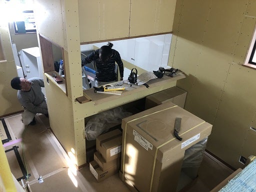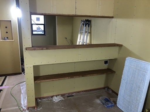 造作材にあわせたカウンターや枠材が空間にマッチしていて、とてもいい感じです。そして、キッチの施工を開始しました。施工前に再度設備屋さんと換気扇の高さやキッチンパネルの範囲の確認、コンセントや電灯配線の確認をし施工開始です。