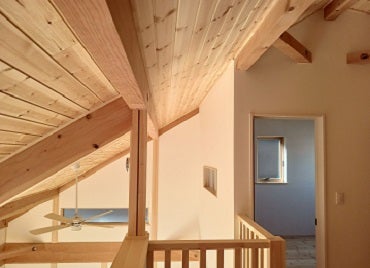 仕上工事も終了しクリーニングを行いました。屋根勾配に合わせた勾配天井にパイン羽目板張りがおおらかな空間にとても馴染んでいます。
