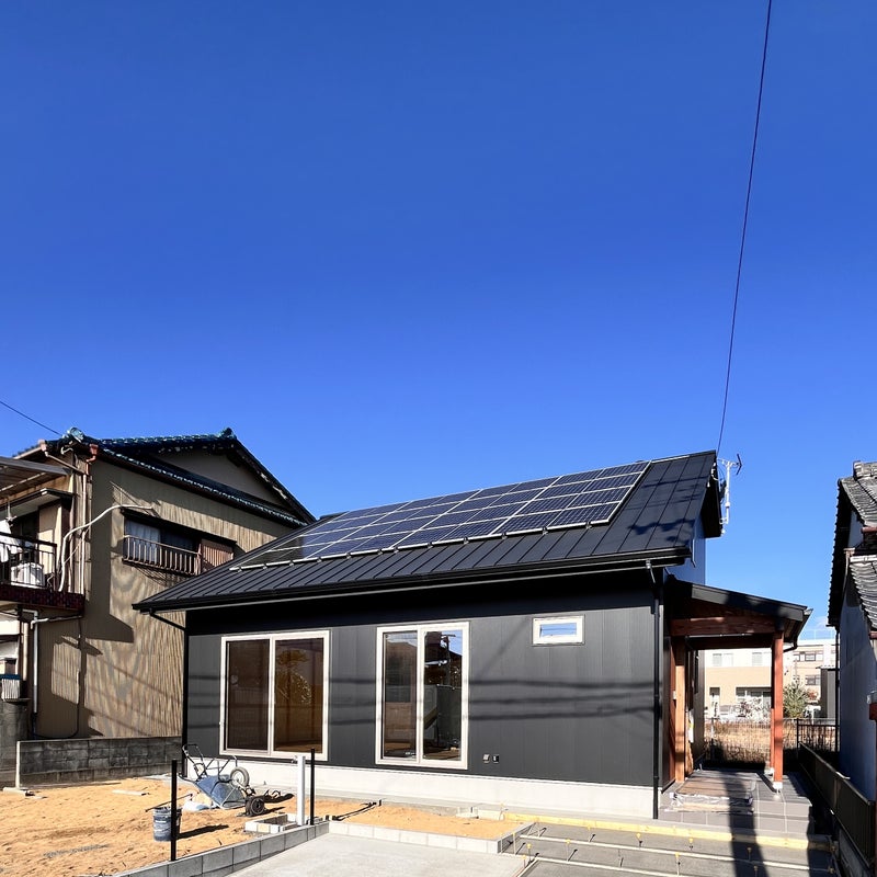 外構工事は年内完成予定です♪外観は黒い外壁とブラウンの木部がアクセントとなってクールな印象。