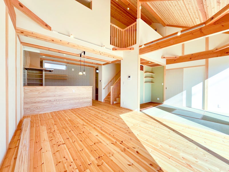 そして内部は無垢材のあたたかい雰囲気がいっぱいの優しい仕上がり。大きな吹抜けで開放感にあふれ、畳からもイグサの良い香りがして心が落ち着きます(*^^*)