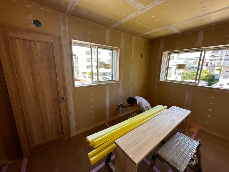 今週からクロス工事が始まりました。 クロスを貼る前に下地のパテ処理を行います。ボードのつなぎ目やビスの穴などをパテで平らにしています。
