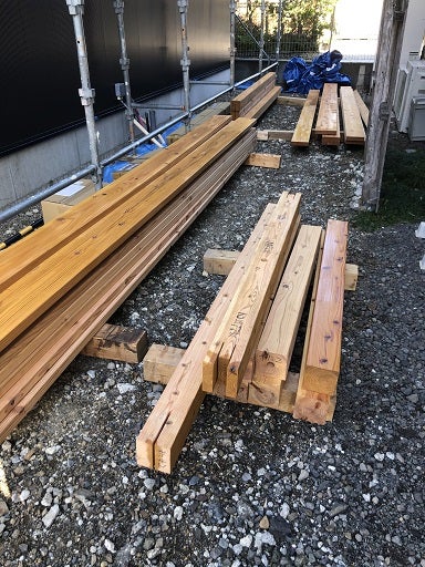 並行して塗装工事も進めています。ウッドバルコニーの材料の塗装から開始しました。