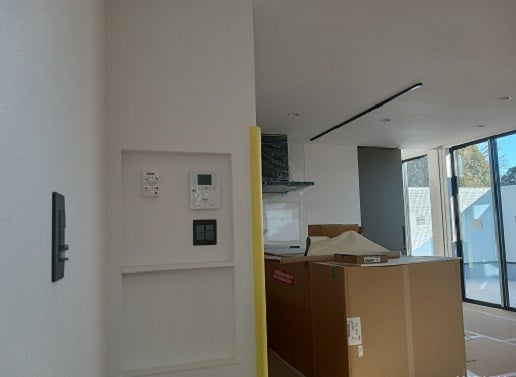 リモコンニッチにもバランス良くインターフォンモニターや給湯器のリモコンが配置され、天井にはダウンライトやライティングレールが取り付きました。