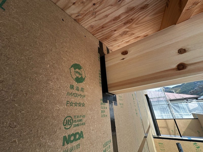 防水紙施工前には外部面材の継ぎ目や母屋周りに気密テープでの処理を施しています。念には念を入れて少しでも気密性が上がるように施工しています。