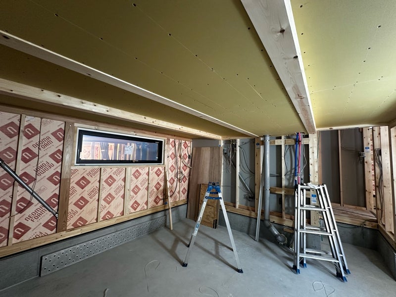 断熱材監査の後は天井の下地組み、天井ボード貼りを行っています。石膏ボードはビスの間隔が決まっているので間隔が広くならないように気をつけて施工しています。