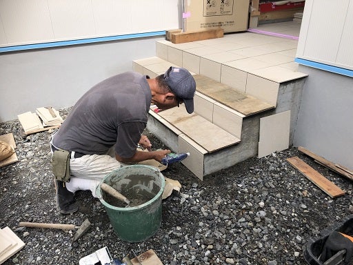 タイル屋さんが、割り付けをして下地をつくり加工しながら丁寧に貼っていきます。
