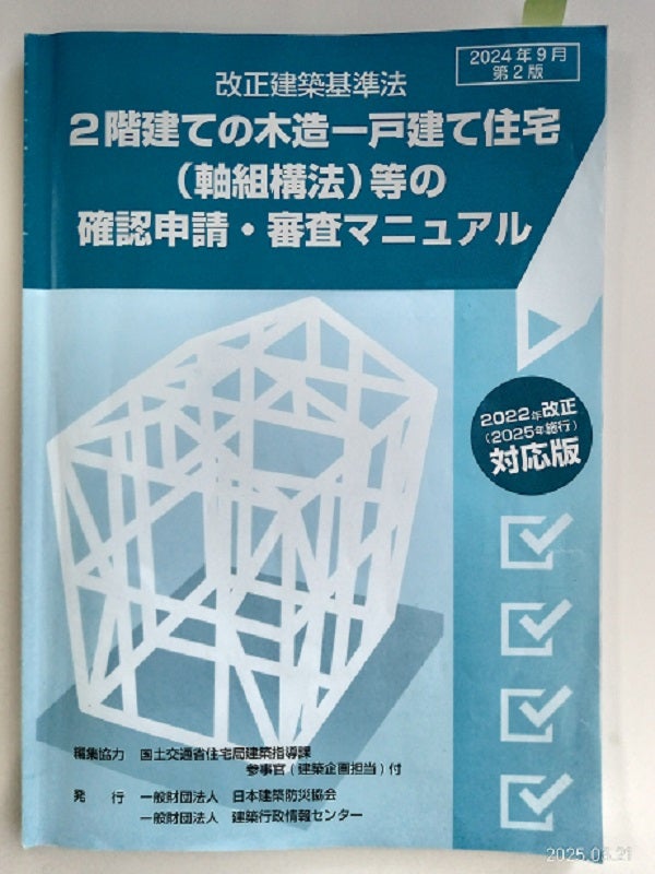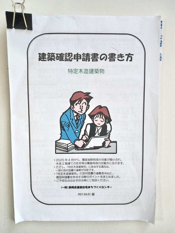 国土交通省からも改正建築基準法についてのマニュアルが発行されていますので、この内容に則って内容確認していきます。変更になった箇所は、省エネ基準への適合性も確認されるので、計算書や技術的な資料、構造詳細図や壁量判定図等、これまで特例により提出義務がなかった部分も審査対象になり、より詳細にチェックすることになります。確認申請は、静岡県まちづくりセンター(まちセン)で審査するので、先ずは事前審査を提出する予定です。