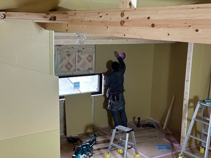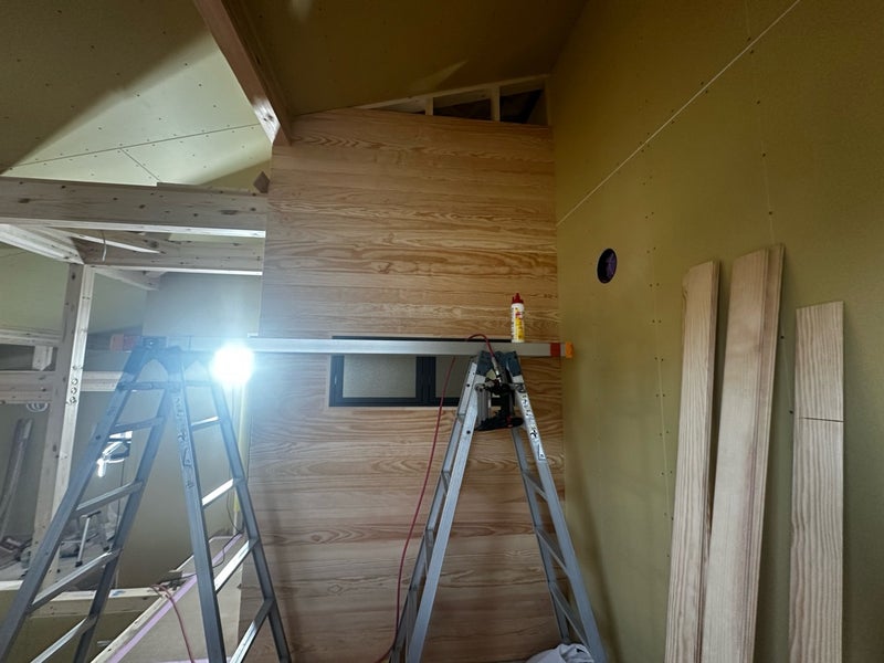 先週から引き続き2階のボード貼りを進めています。セカンドリビングの一部はパインの羽目板仕上げになっています。リクシル製の室内窓(デコマド)も取り付けて良い感じのアクセントウォールになりました!