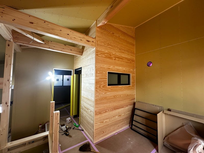 これで2階の木工事は完了です。羽目板もキレイに仕上がっています。スキップフロアの大空間に良いアクセントになっていると思います。大工さんは来週からはインサイドストッカーの木工事へと進んでいきます。水廻りのクッションフロアやキッチンのフロアタイルの施工も行うのでそちらも楽しみにしていてください!