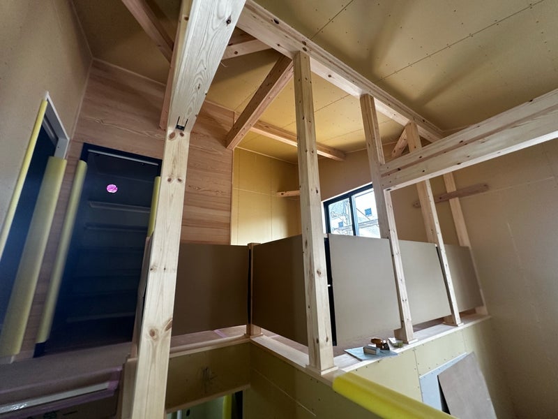 大工さんの工事が順調に進んでいます。今週はセカンドリビングの羽目板施工と廻縁、巾木やスチール手すりなどの取り付けを行いました。