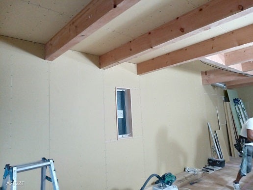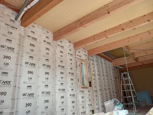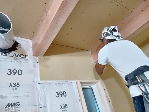 この上に石膏ボードを貼っていくのですが、断熱材が厚いのでボードを押しながらビスを打っていくのが意外と大変です。(棟梁談)
