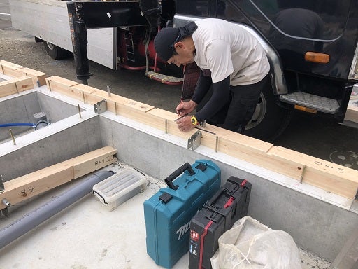 基礎から出ているアンカーボルトの位置を土台に印しをしていきます。