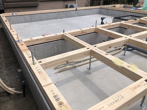 アンカーボルトにナットを取付けて、基準の墨にあわせながらしっかりと緊結していきます。各パッキンのずれ等もここで確認します。大引きの施工も鋼製束を調整して平らになっているのをしっかりと確認します。