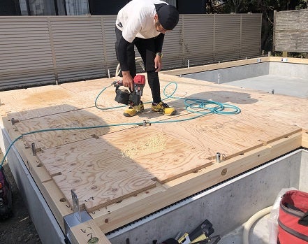 最後に床の構造用合板を指定の釘及び間隔で留めつけて作業完了です。