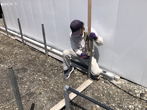 敷地からの離れ寸法を印していきます。境界線の位置を確認ししっかりと離れ寸法を確認します。