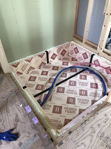 明日にユニットバスの施工を控え基礎断熱材の施工及び外壁面のボード張りも並行して進めました。