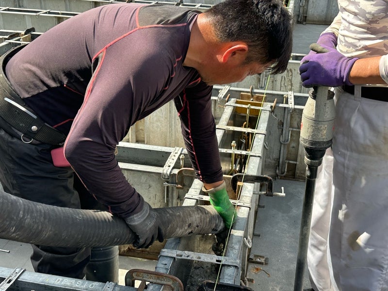 生コン車で運んできた生コンをポンプ車で圧送して型枠の中に流し込んでいきます。決められた高さまで流し込んだら表面をコテで整えていきます。