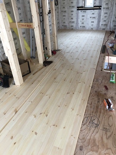 現場内は無垢の木の香りに包まれてとても気持ちがいいです。施工後は傷や汚れ防止のためにすぐに養生をしてしまうので一面に広がる床板を見ることができるのは完成時になります。
