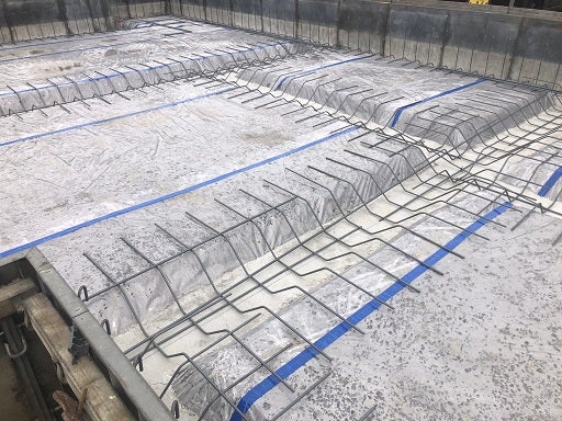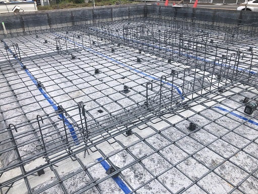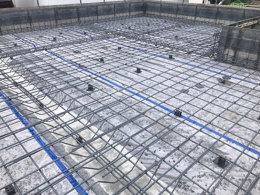 まずは外周部と内部の梁の鉄筋を敷きならべ床及び外周部のタテ筋を組んでいきます。
