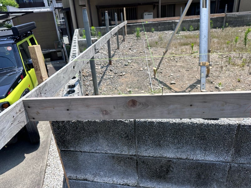 先ずは配置の確認です。敷地の境界線や建物の設計GLを確認し、配置を出すための杭と貫板を設置していきます。この水平に設置した貫板の高さを基準にして工事を進めていきます。