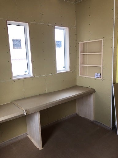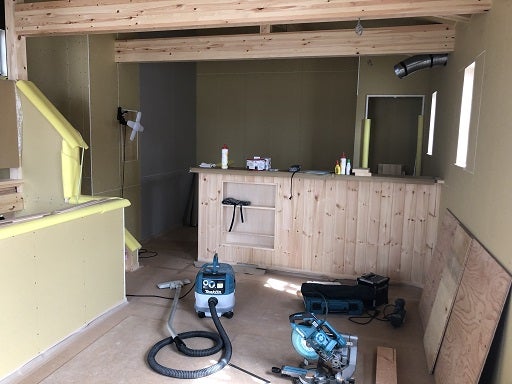 内部も外部も工事は順調に進んでいます。内部ではセカンドリビングの造作カウンターの取付工事が終わりました。